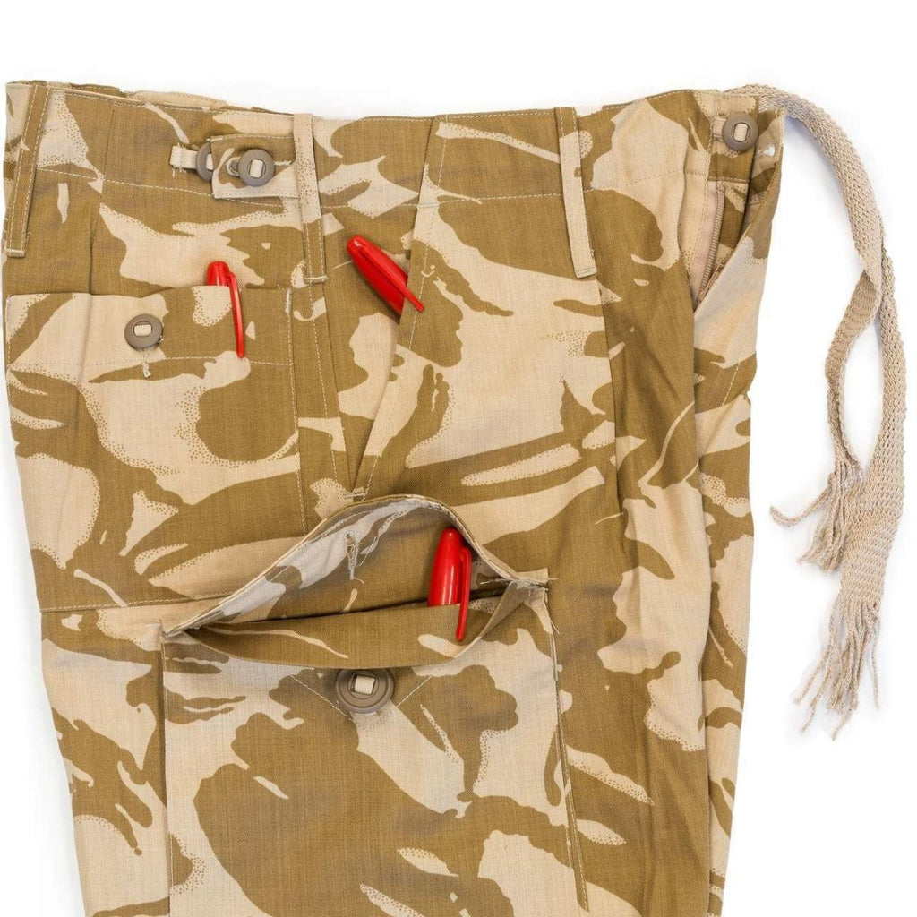 Äkta British Army Combat Trousers Desert Military Pants 95 Lightweight, ett bevis på brittisk militär excellens och anpassningsförmåga. Dessa stridsbyxor är speciellt designade för ökenmiljöer, och kombinerar lätt konstruktion med viktiga funktioner för militär personal i tjänst.