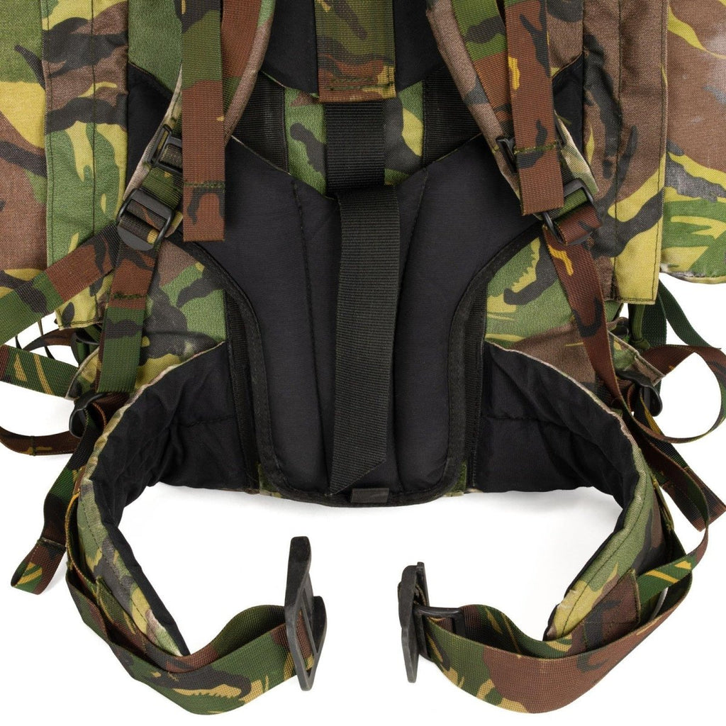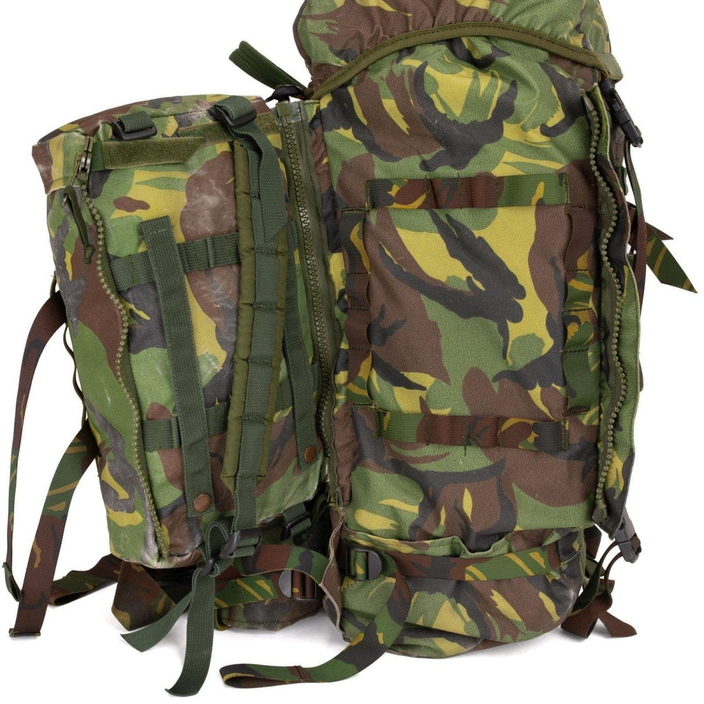 Original holländsk armé DPM kamouflagemönster stridsryggsäck tillverkad av ARWY. Denna robusta ryggsäck har ett huvudfack med en generös kapacitet på 60 liter och löstagbara sidofickor på båda sidor, som var och en lägger till ytterligare 10 liters kapacitet (totalt 20 liter). De fristående sidopåsarna kan dras ihop och bäras bekvämt som ett litet dagspaket. En aluminiumram är integrerad i bakpanelen för att ge robust stöd och optimal viktfördelning för tunga laster, vilket gör denna ryggsäck idealisk för långa uppdrag, taktisk användning och utomhusäventyr.