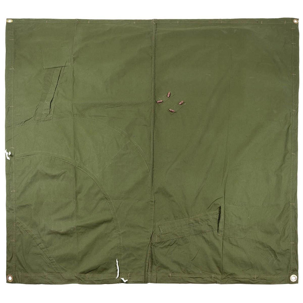 Det här stycket vattentäta presenningstältet är tillverkat av canvas bomull och har parade knappar och nyckelhål. Den kan knäppas till andra Shelter-halvor för att bilda tält både små och stora. Den kan också bäras som en vattentät regnkappa/poncho, detta utgör basen på huvan, medan du bara knäpper upp framsidan och sticker armarna genom de öppningsbara springorna.