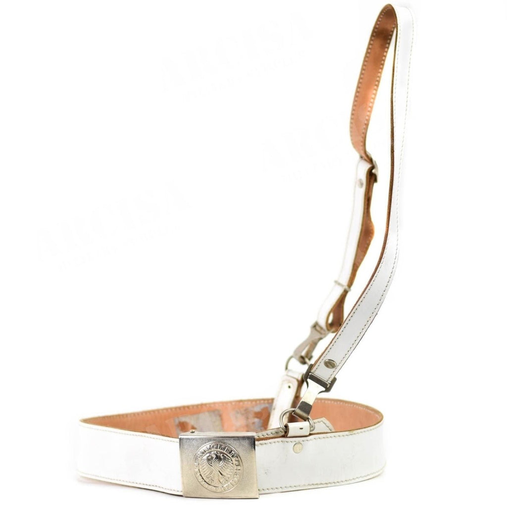 - Tillverkat av högkvalitativt läder visar detta polisparadbälte utmärkt hantverk och uppmärksamhet på detaljer. Dess slående vita färg bidrar till dess formella och ceremoniella utseende. Bältet har också en axelrem, vilket förstärker dess kungliga och värdiga estetik.