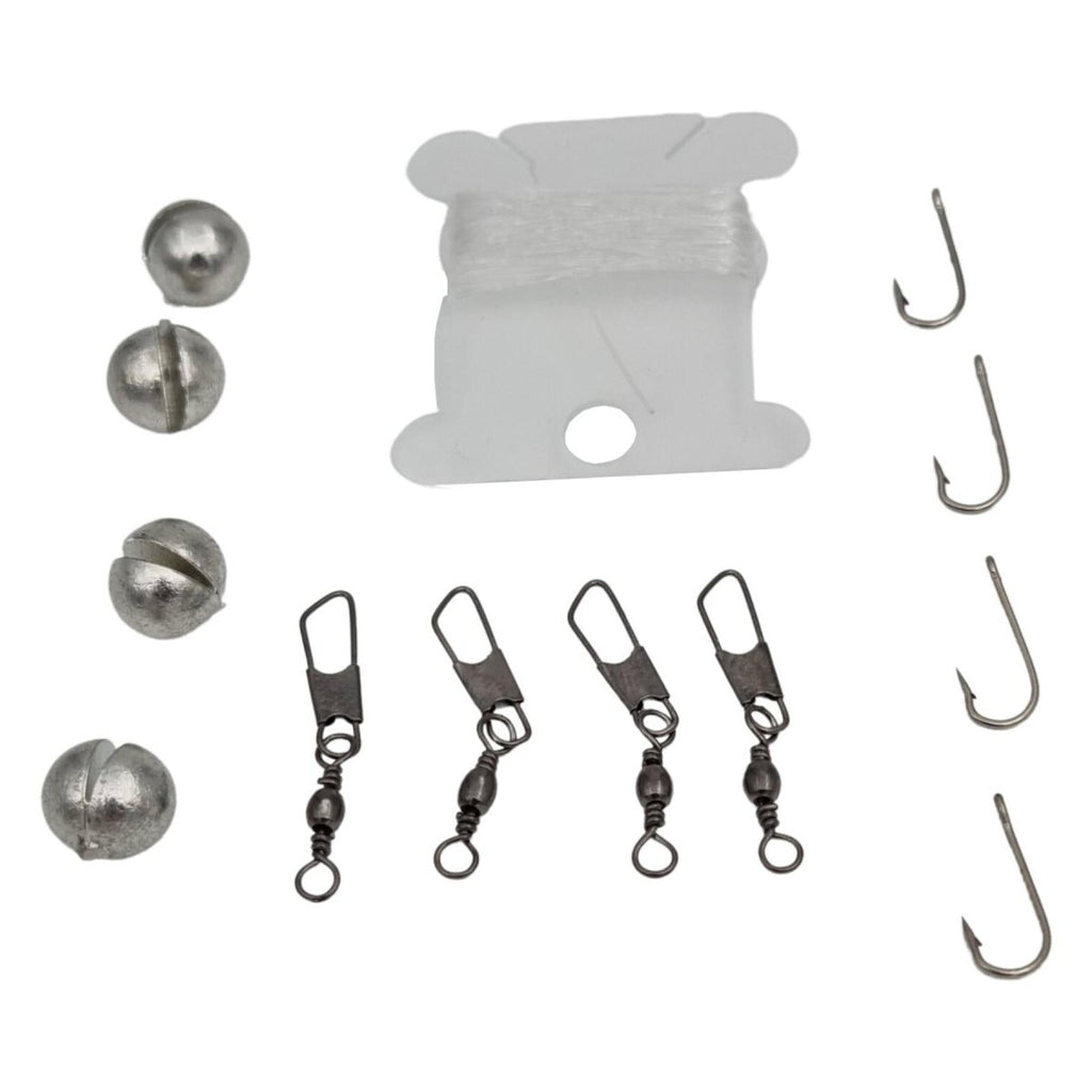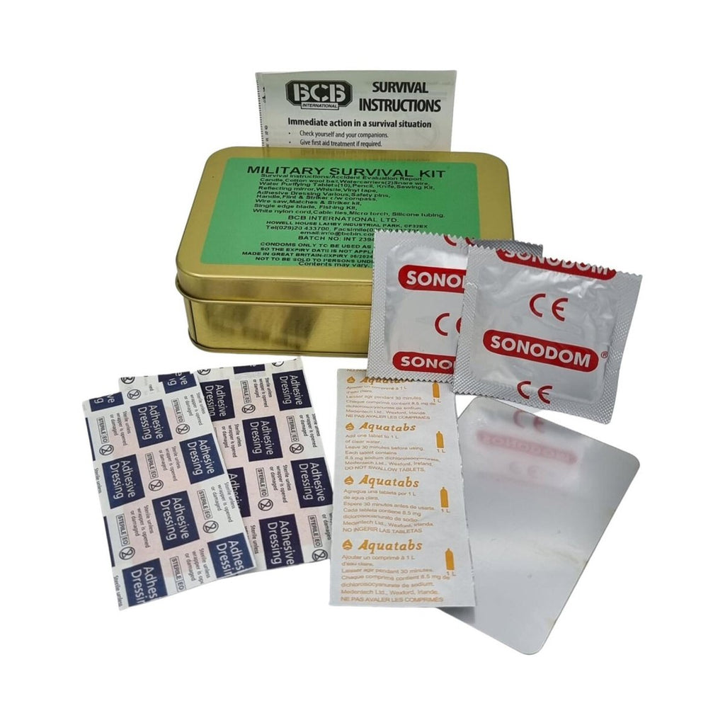 Setet innehåller: vattenavvisande plåt, vinyltejp, ett låsbart knivblad, vattentäta tändstickor och anslag, penna, vattenreningstavlor, snartråd, nattljusljus, eldklotsflinta och anfallare med knappkompass, fiskekit, nödvissling, sykit, säkerhetsnålar, grundläggande trådsåg, signalspegel, plåt-till-hängande handtag, plåt-till-upphängt handtag, rakhyvlar, lim sterila plåster, osmorda kondomer (vattenbärare) överlevnadsinstruktioner, olycksutvärderingsformulär.