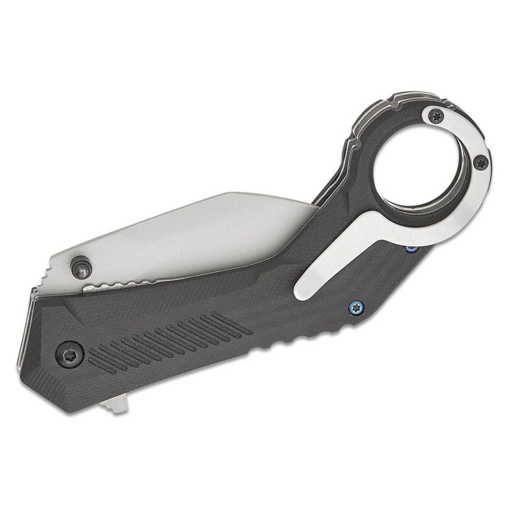 - Bladet, tillverkat av premium 440C rostfritt stål, skär smidigt och motstår korrosion. Dess hökräkning kurva förbättrar precisionen och skärningskontrollen, vilket gör varje snitt snabbt och rent. Stenen tvättad avsluta skyddar bladet och ger det ett robust, professionellt utseende.