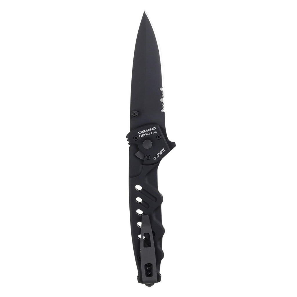 - De delvis tandad kniv tillägger extra mångsidighet, så att du kan skära igenom tuffare material med lätthet. Dess helsvart finish ger kniven en elegant, taktiskt utseende, perfekt för militär, brottsbekämpande och friluftsentusiaster.