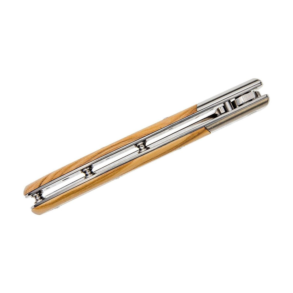 - De handtag i olivträ visar ett unikt naturligt korn. Ramar i rostfritt stål ger styrka och en polerad, klassisk touch. Kniven balanserar elegans med hållbarhet, vilket gör den lämplig för både dagligt bruk och speciella tillfällen.
