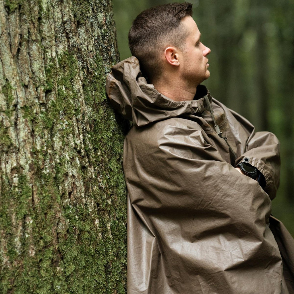 En vintage tysk militär huva poncho tillverkad av vattentätt material, utformat för att skydda bäraren från regn och andra element. Huven ger ytterligare skydd för huvudet, vilket gör det till ett praktiskt val för utomhusaktiviteter och fältverksamhet.