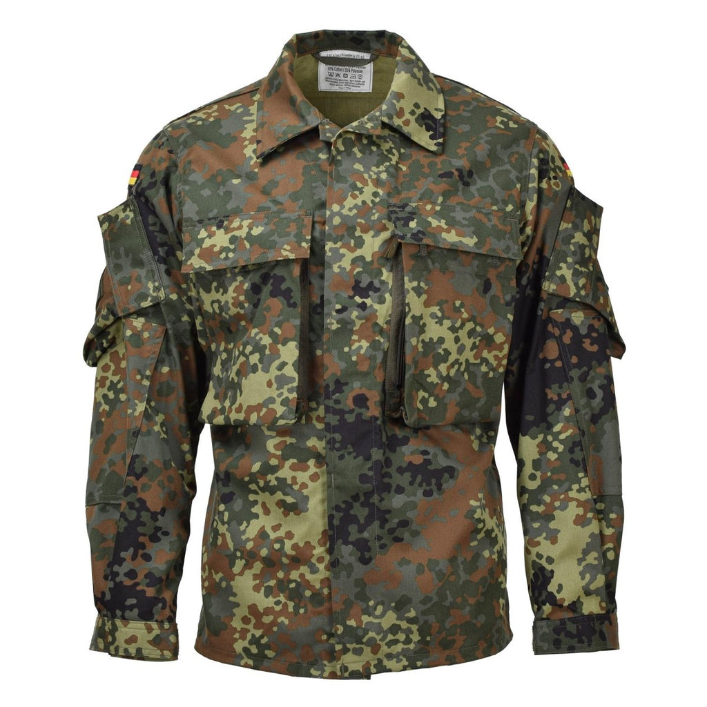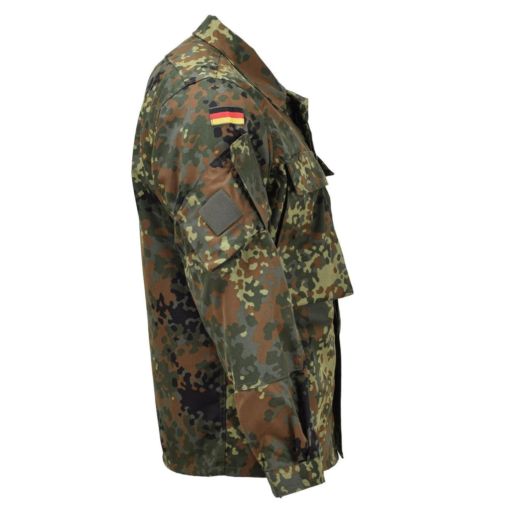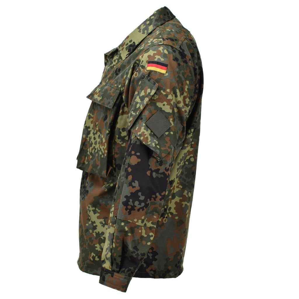 - Dessutom säkerställer det andningsbara tyget på flecktarn camo-skjortan komfort under långvarig användning, medan de justerbara ärmsluten möjliggör en skräddarsydd passform. Dessutom ger skjortans förstärkta armbågar extra hållbarhet i områden med hög påverkan. Dessutom ger införandet av en tysk flagga på varje arm en patriotisk touch som återspeglar dess militära arv.