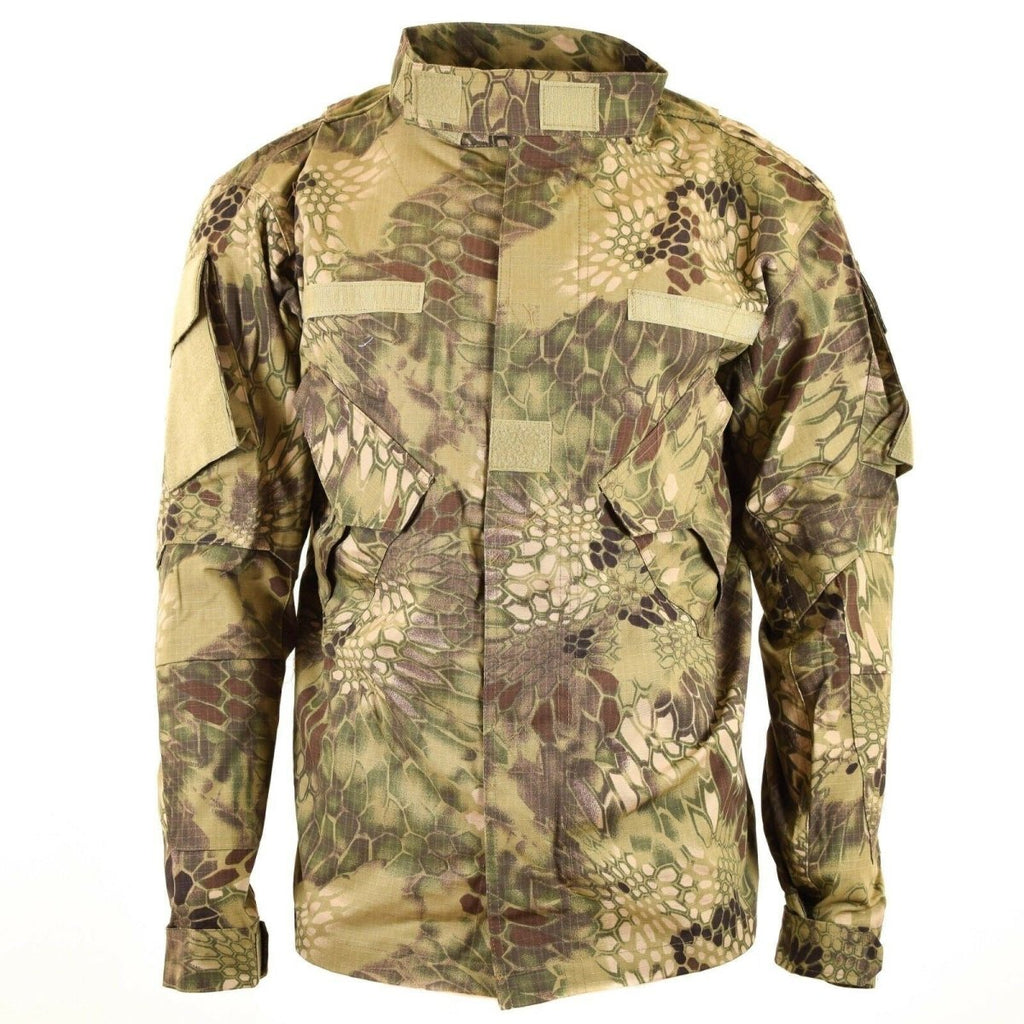 MFH Mission Snake FG Camouflage Combat Jacket är mer än bara kläder; det är en symbol för militär precision och beredskap, designad för dem som söker både funktionalitet och stil i sin klädsel. Med sin ripstop-konstruktion, mångsidiga kardborrefästplattor, stormklaff och praktiska armfickor, förkroppsligar denna jacka andan av taktisk förträfflighet.