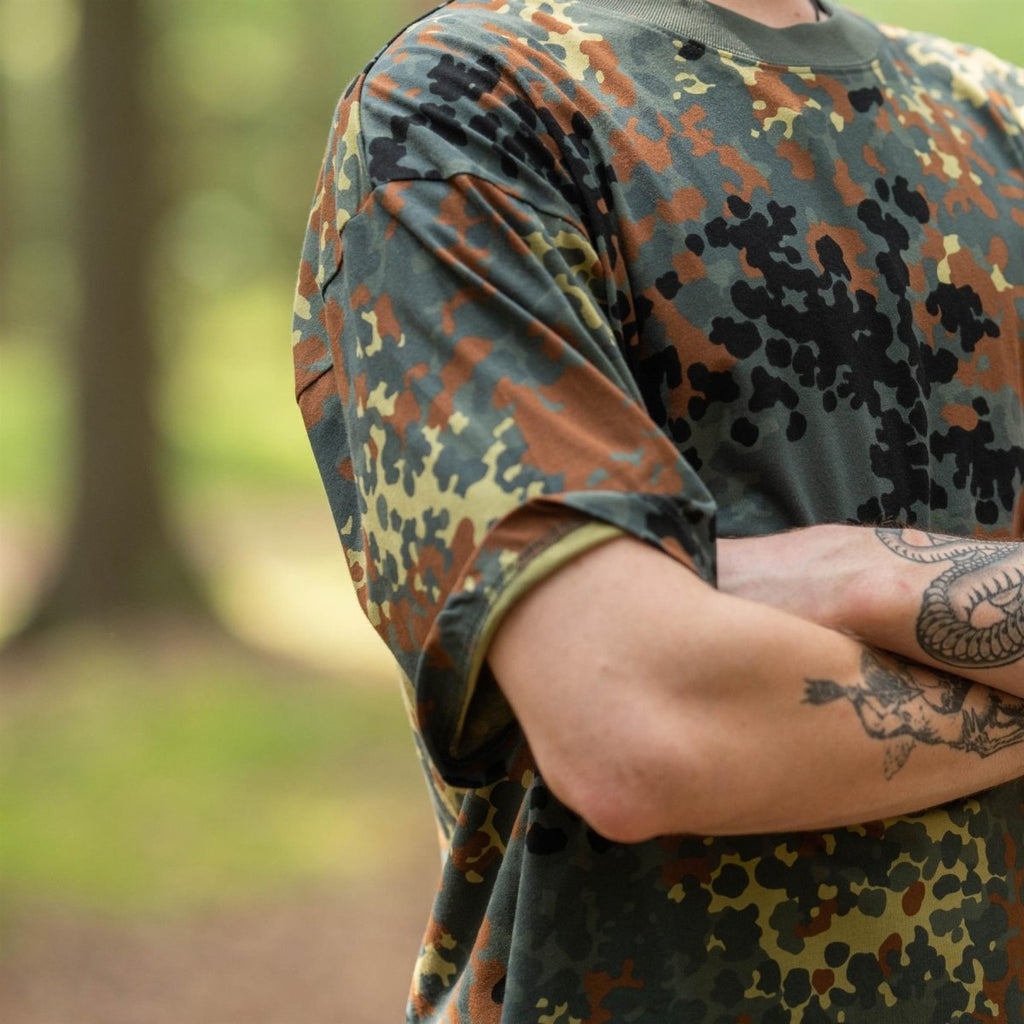 - Förutom dess funktionalitet säkerställer t-shirtens hållbarhet att den kommer att hålla genom många äventyr. Dess lätta design och komfort gör den till ett utmärkt val för alla aktiviteter. Om du letar efter en mångsidig, slitstark och bekväm skjorta är flecktarn-t-shirten det perfekta alternativet för dig.