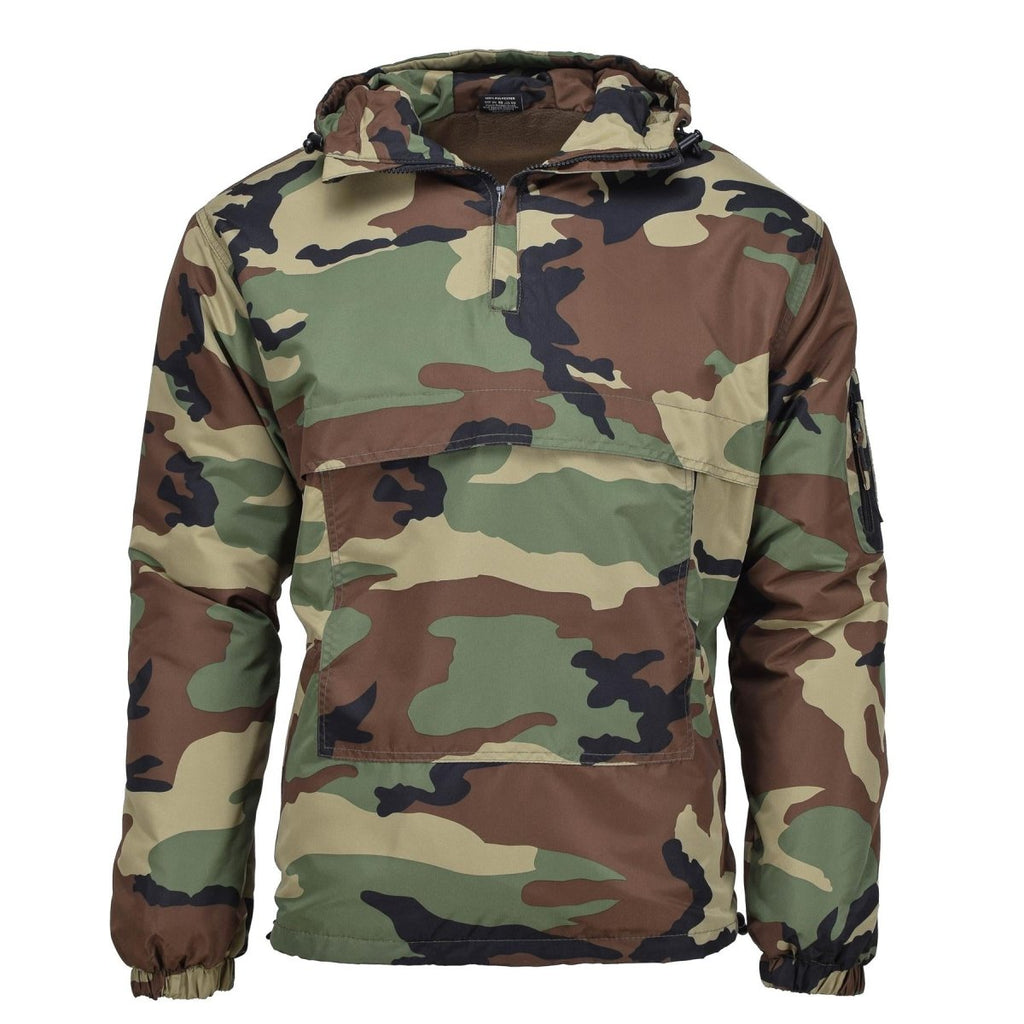 Mil-Tec Military Combat Anorak Woodland Camo Jacket är en vinterjacka designad för användning i skogsmiljöer. Den har ett vindtätt yttre skal och en huva med en foder för att ge värme och skydd under kalla väderförhållanden. Den är utformad för militär användning och kan också användas i olika utomhusaktiviteter.