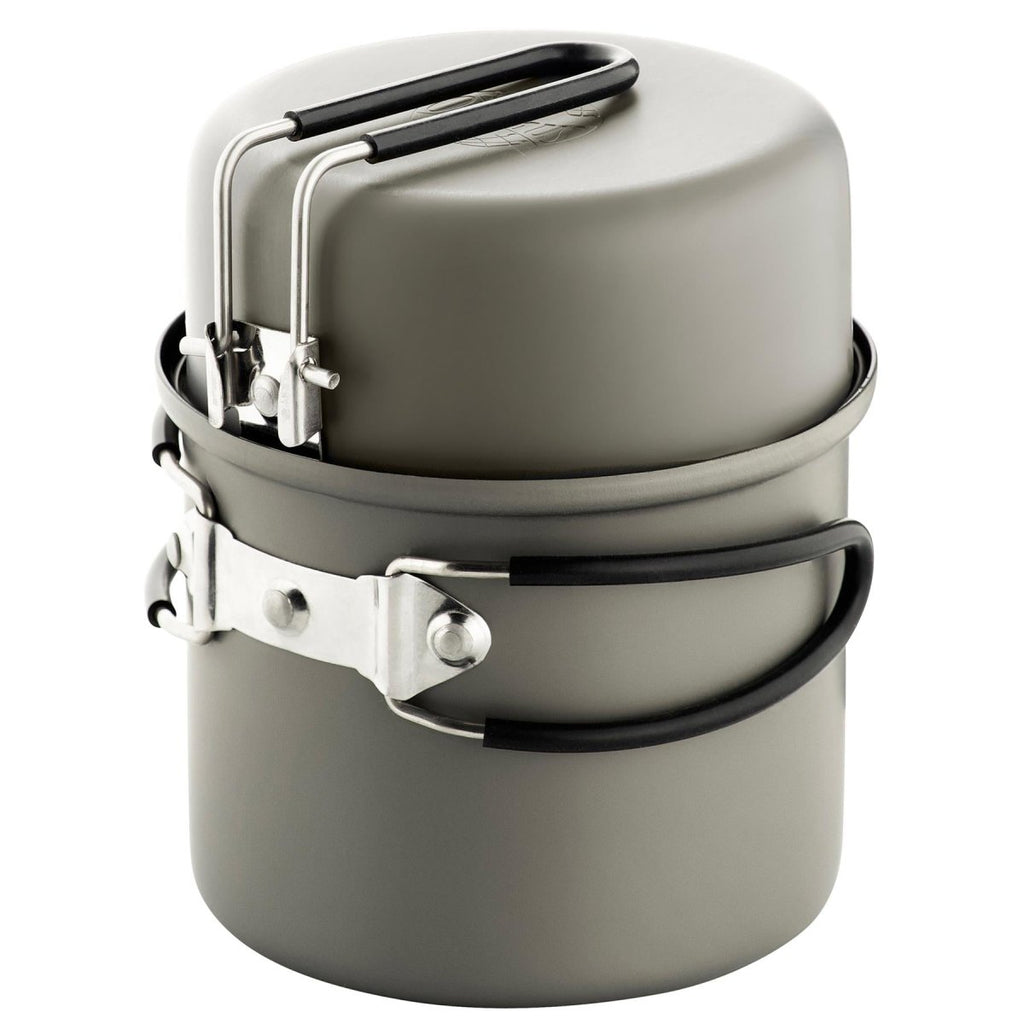 - Detta högpresterande underverk inkluderar en hårdanodiserad aluminiumpanna med lock, en non-stick-belagd kastrull, en vindruta för flamskydd, en bränslesnål spis, ett stabilt stativ, en praktisk förvaringsväska och en användarmanual.