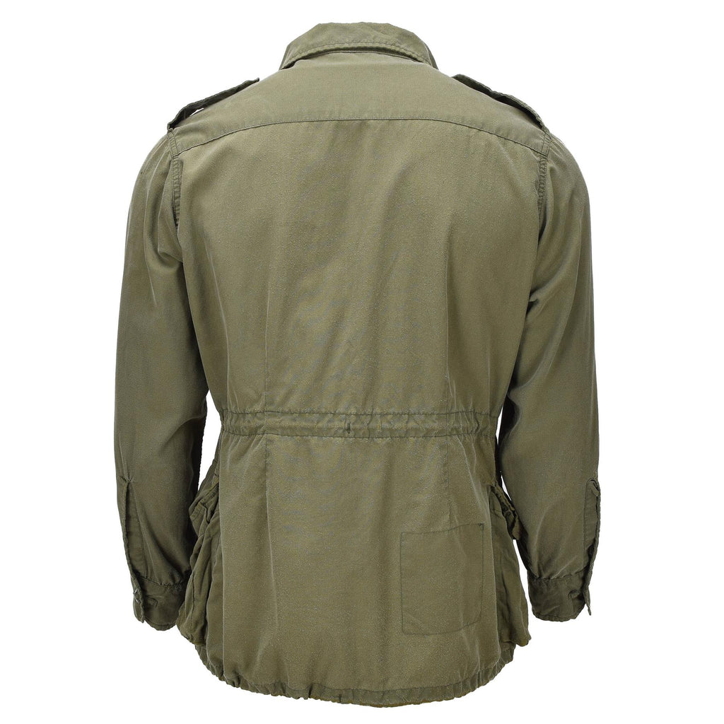 Äkta kanadensisk armé stridsfältsjacka från original militärt överskott. Tillverkad av slitstarkt bomullstyg, är denna lätta jacka designad för fältoperationer och hela säsongen. Den har fyra stora fickor med knappar, justerbar dragsko i midjan, förstärkta sömmar och axelepauletter för en klassisk militär look. Dessa jackor visar starka tecken på slitage och skavning på grund av tidigare användning, men förblir fullt fungerande. Se noga bilderna för skickdetaljer. Den olivgröna färgen och vintagedesignen gör den perfekt för samlare, reenactors eller alla som värdesätter äkta armékläder.