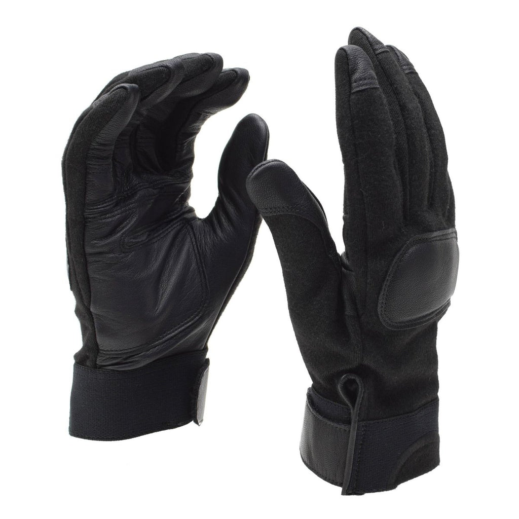 - Tillverkade av en hållbar blandning av 46% läder och 54% meta-aramid, dessa handskar kombinerar flexibilitet och styrka. Denna unika materialblandning förbättrar både komfort och motståndskraft, vilket gör att du kan arbeta effektivt under en mängd olika förhållanden. Den eleganta svarta designen gör dessa handskar mångsidiga, lätta att para ihop med vilken taktisk utrustning som helst.