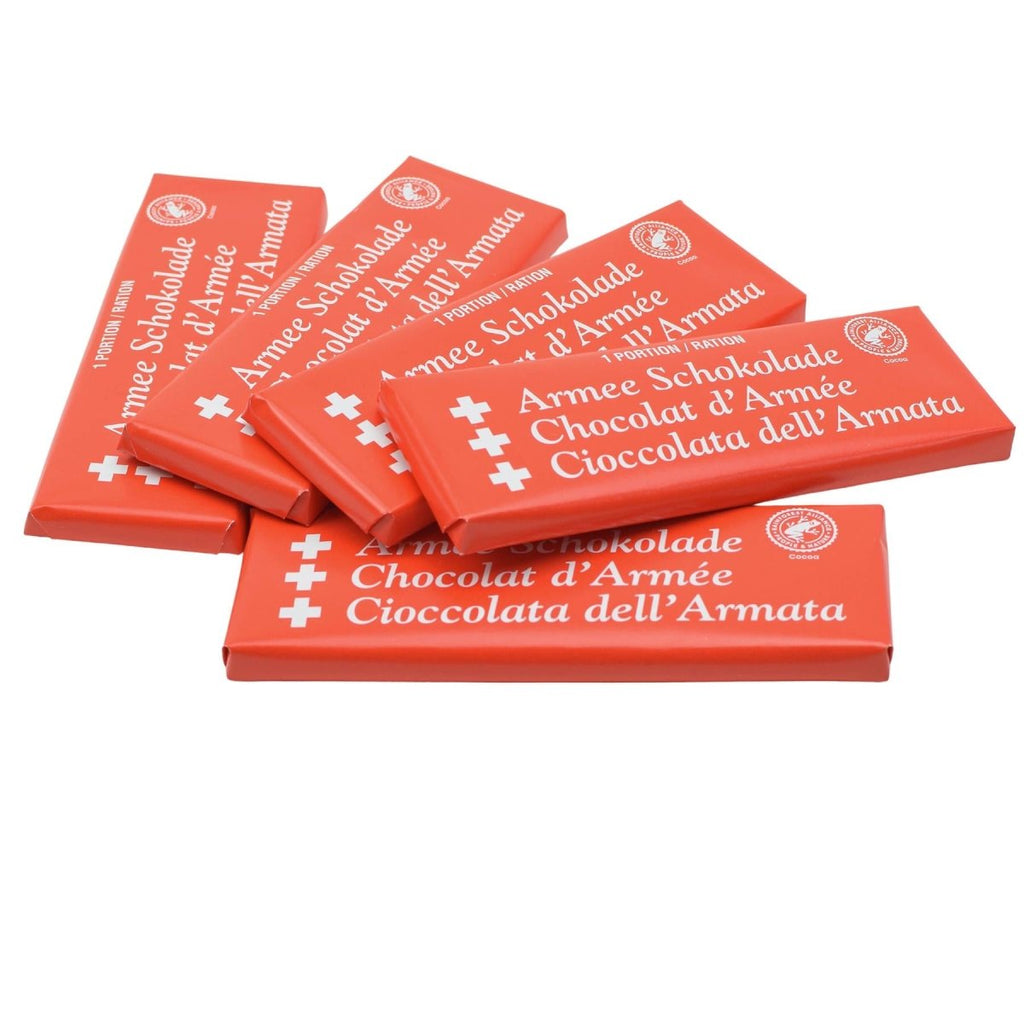 - Perfekt för utomhusäventyr eller en snabb energikick, denna läckra chokladkaka ger en tillfredsställande njutning när du behöver det som mest. Med minst 35 % kakao kombinerar den schweiziska militärchokladen rika smaker med en hint av vanillin för en härlig upplevelse.