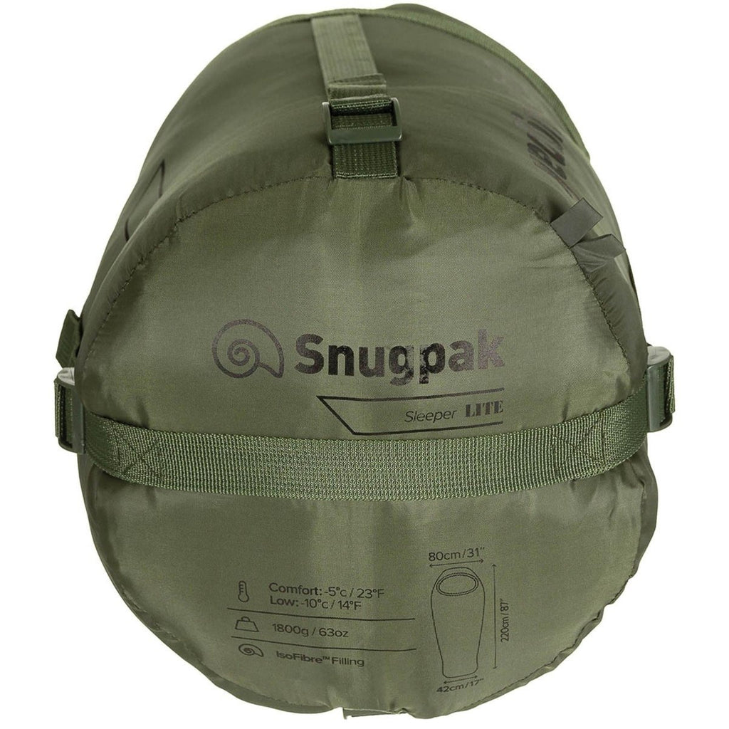 - Med en bredd på 80 cm vid axeln och 42 cm vid foten ger denna sovsäck gott om plats samtidigt som den är lätt att bära. Den är 220 cm lång och rymmer de flesta användare bekvämt. Snugpak Sleeper Lite sovsäck väger endast 1800 gram (63 oz), vilket gör den lätt nog för långa vandringar.